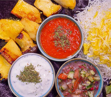 Unser veganer Koobideh aus Soja ist eine köstliche pflanzliche Alternative zum klassischen persischen Spießgericht. Sorgfältig gewürzt und gegrillt, wird er mit einer schmackhaften Beilage und duftendem Safranreis serviert