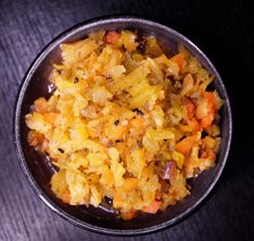 Weich gekochtem Kürbis und Auberginen, in einer Tomatensauce geschmort und mit orientalischen Gewürzen verfeinert