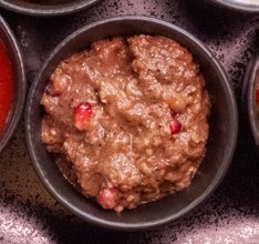 Ein köstlicher Genuss, bestehend aus gerösteten Auberginen, die zu einer cremigen Mischung püriert und mit aromatischen Gewürzen verfeinert werden, ideal als geschmackvoller Dip zu unserem frisch gebackenen Brot oder als Beilage zu gegrillten Speisen